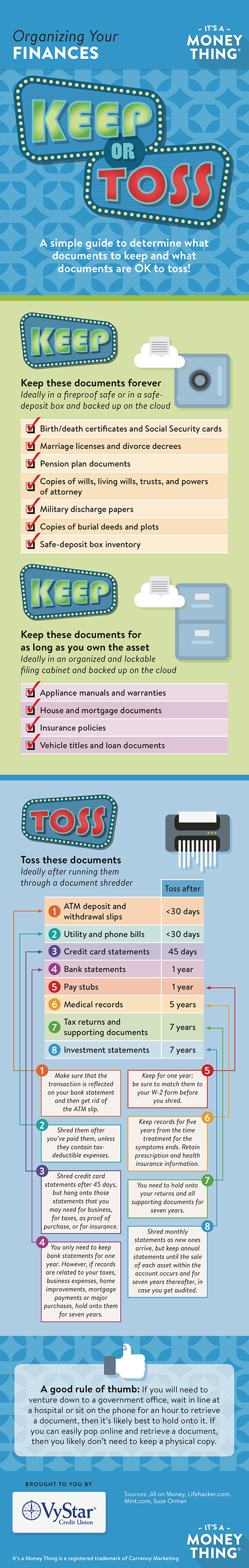 Your “keep forever” documents should be kept in a secure place. A locking file cabinet in your home is a popular choice, but consider upgrading to a safer alternative, such as a fireproof safe in your home or a safe-deposit box at your credit union or bank. Also consider scanning these documents and having them backed up on the cloud (and password protected, of course) so that you can access them remotely and quickly in an emergency.
